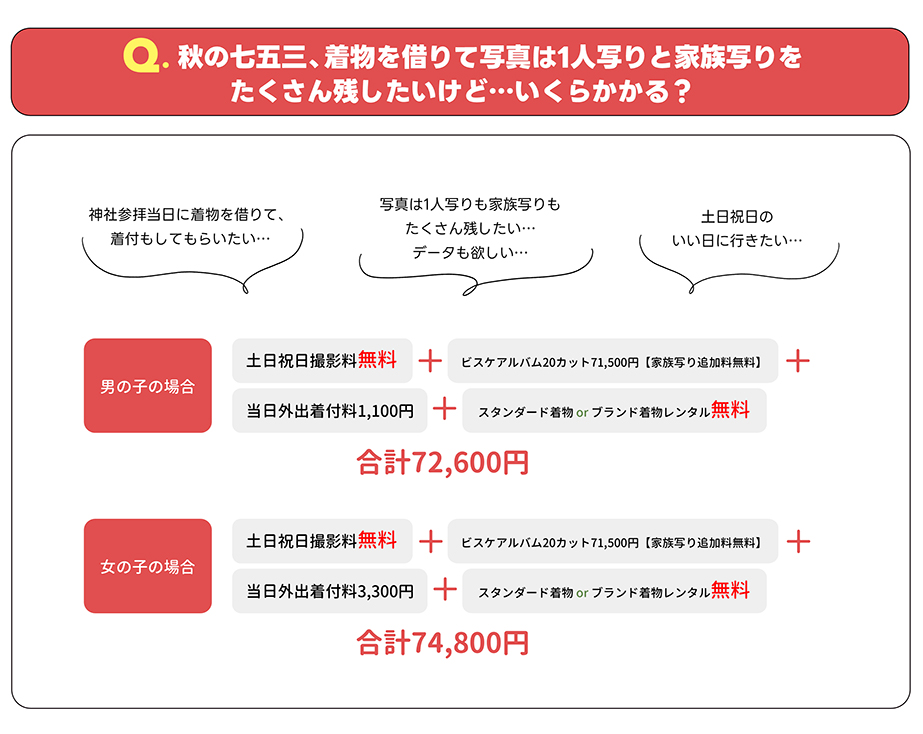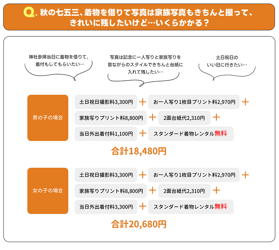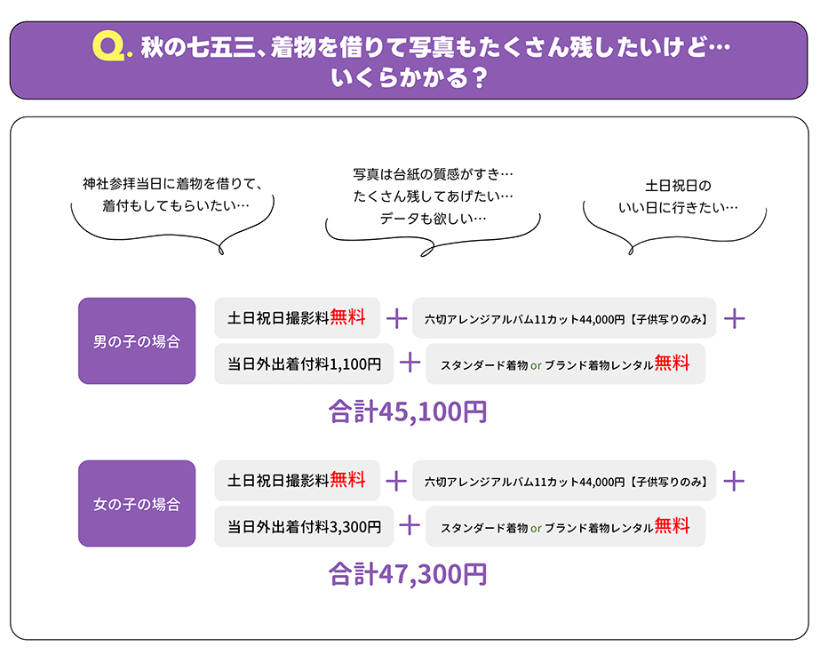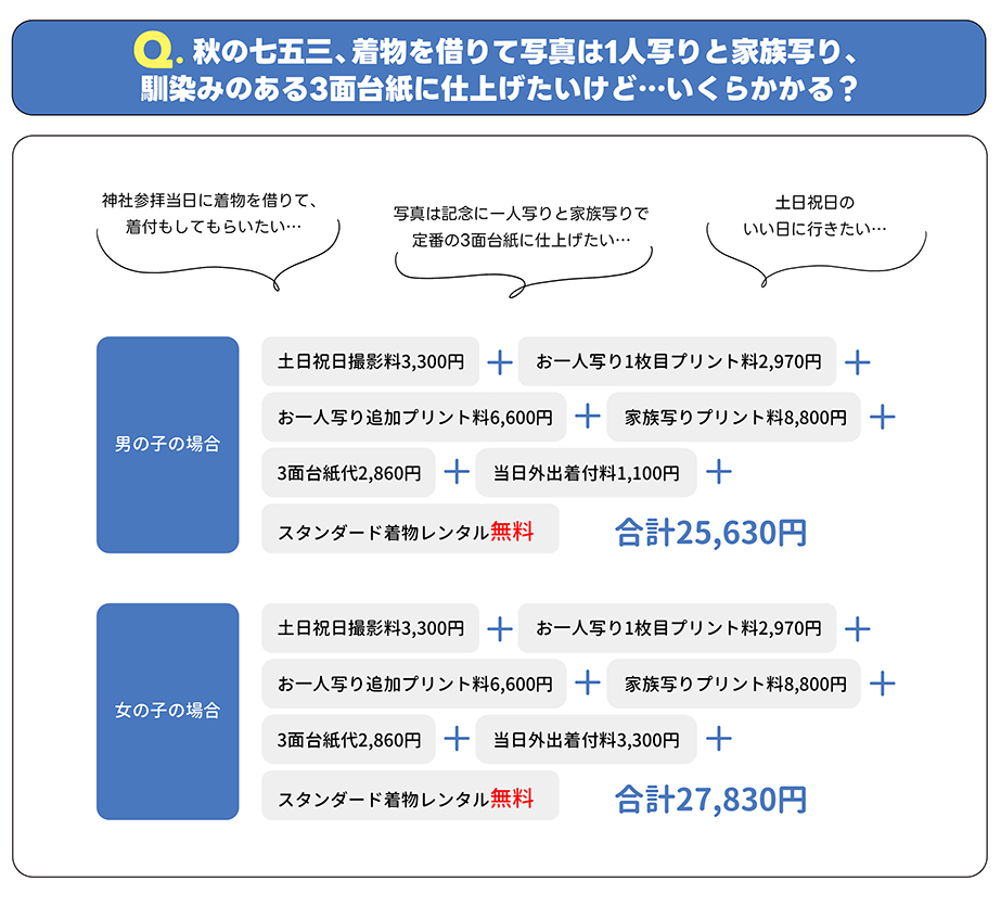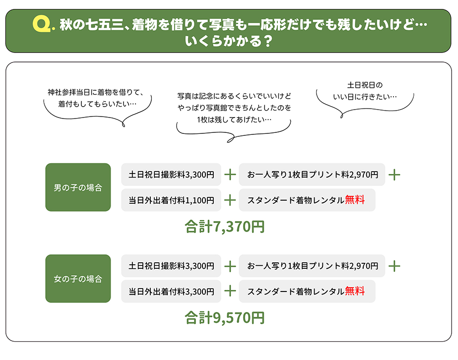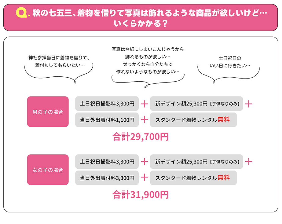 | スタンダード着物 | 3,300円 | 七五三撮影された方いつでも無料 |