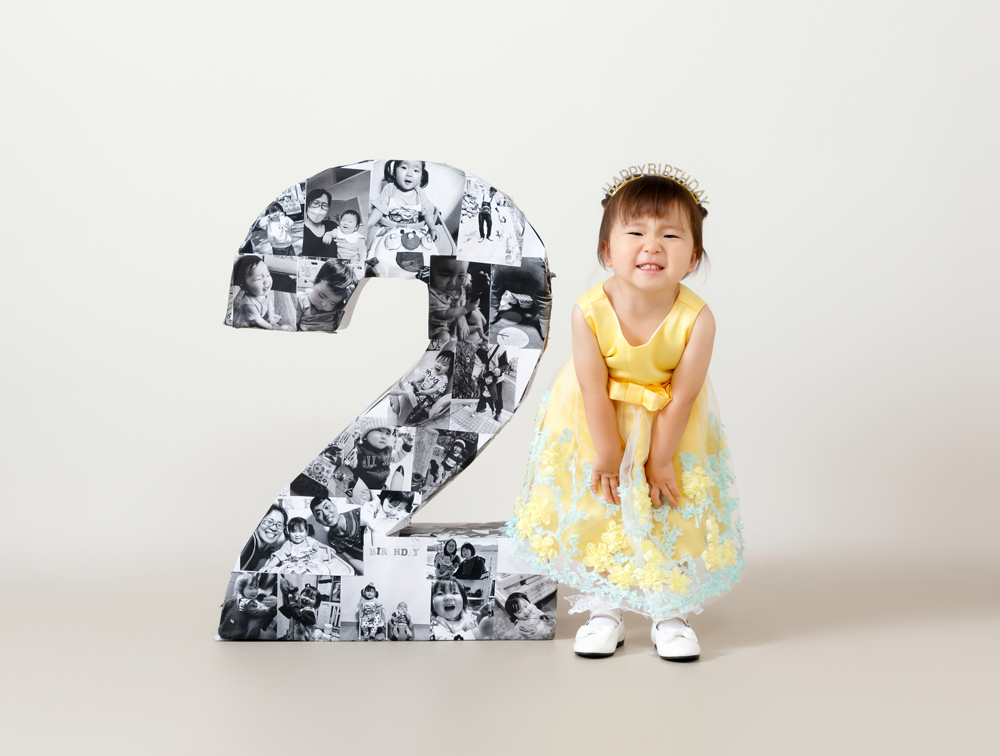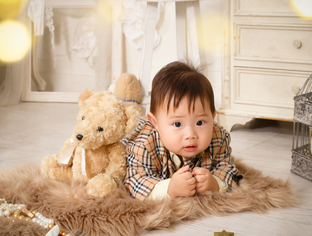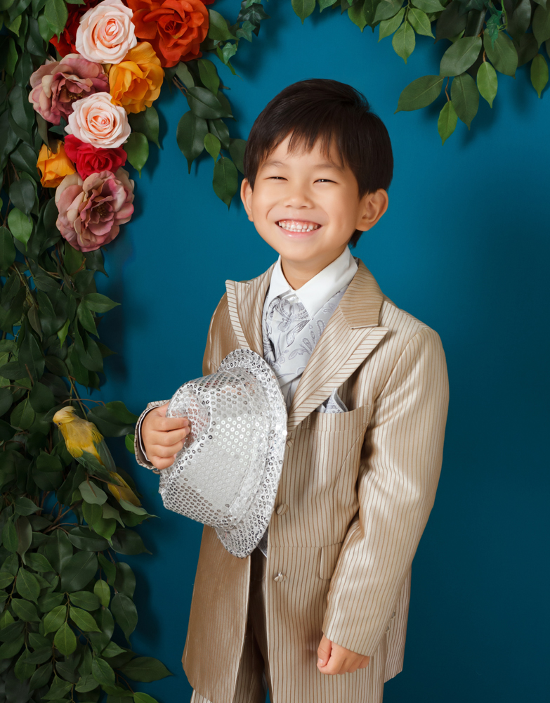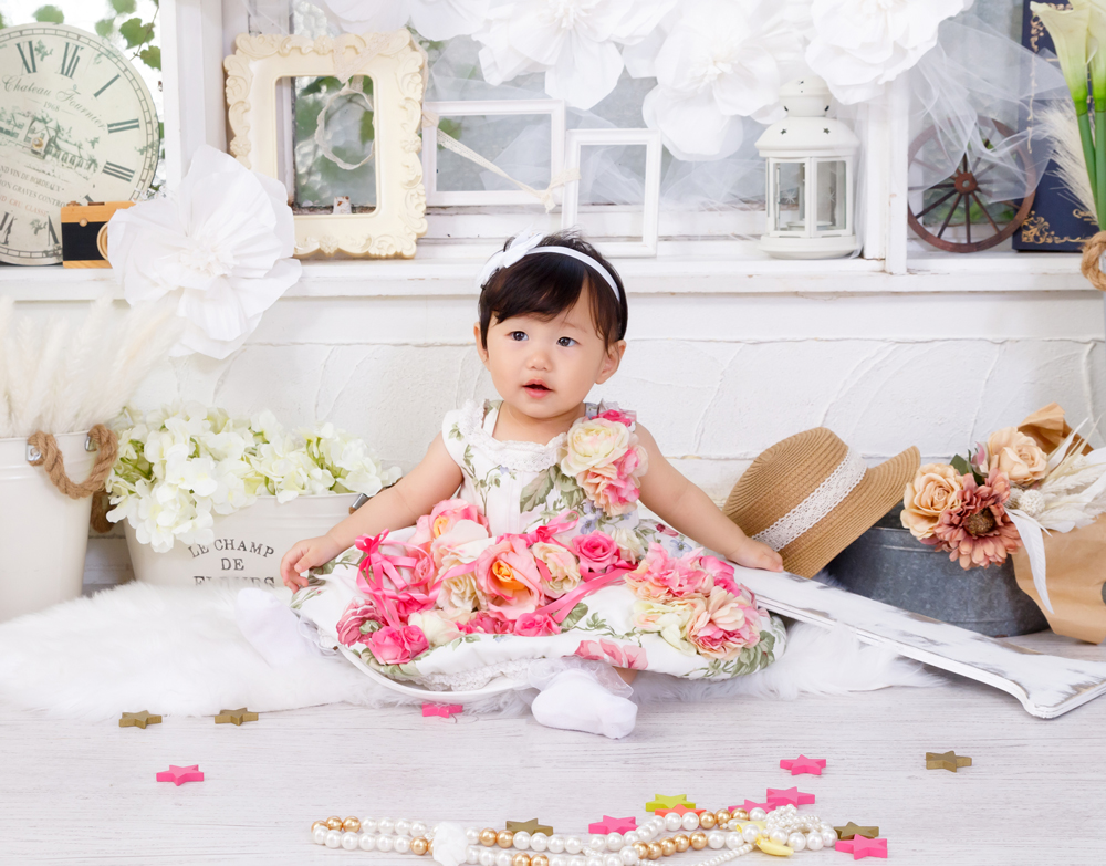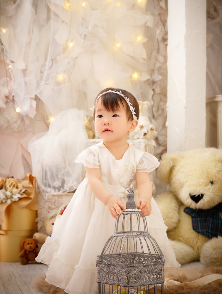 話しかけながら自然な表情を引き出します。小物も使ってたくさんのカットをポーズや撮影します。
