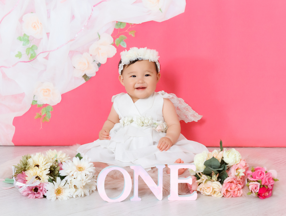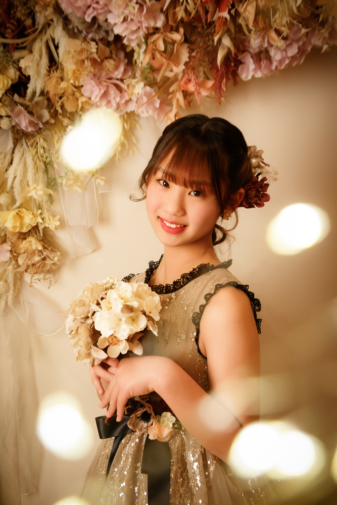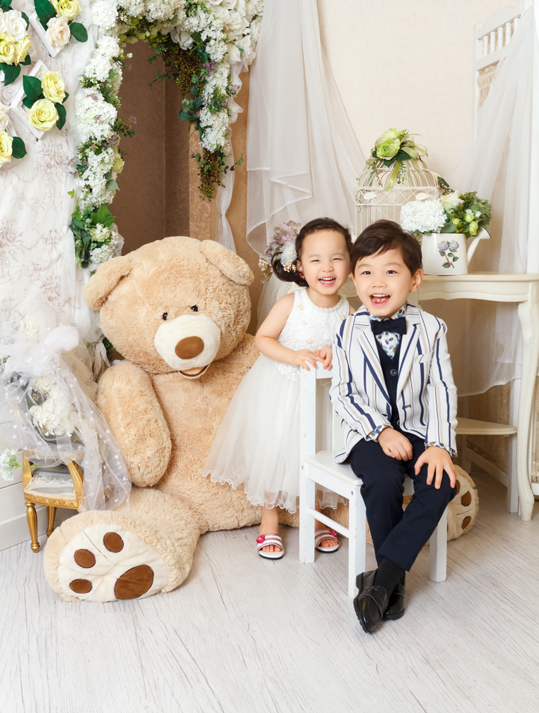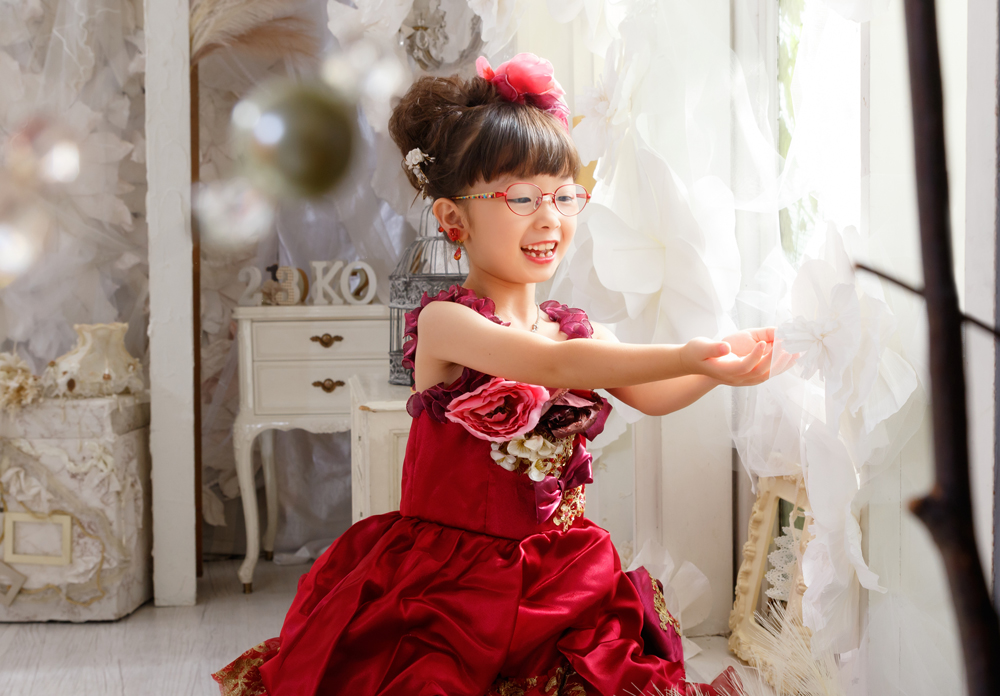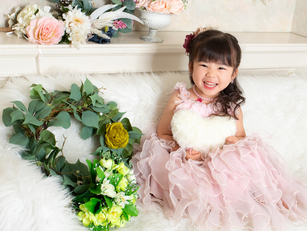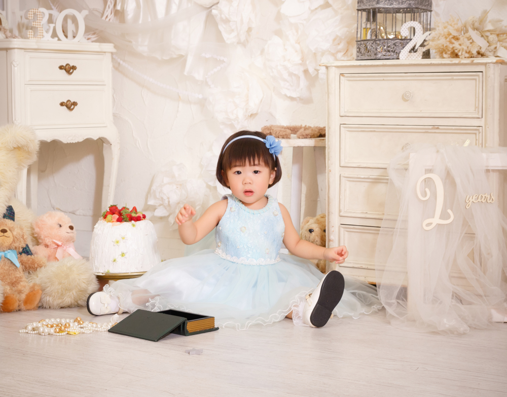 話しかけながら自然な表情を引き出します。小物も使ってたくさんのカットをポーズや撮影します。